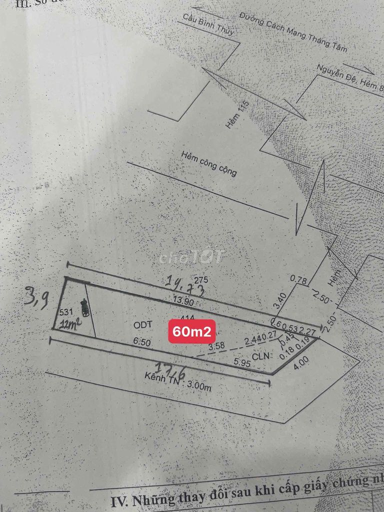 | Nhà hẻm xe hơi, hoàn thiện cơ bản | Hẻm 115 CMT8, An Hòa, Ninh Kiều | 60 | 1.050 | 17,5 | Pháp lý rõ ràng, hẻm thông, hướng Đông Nam |