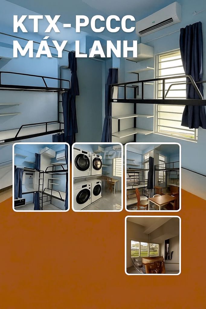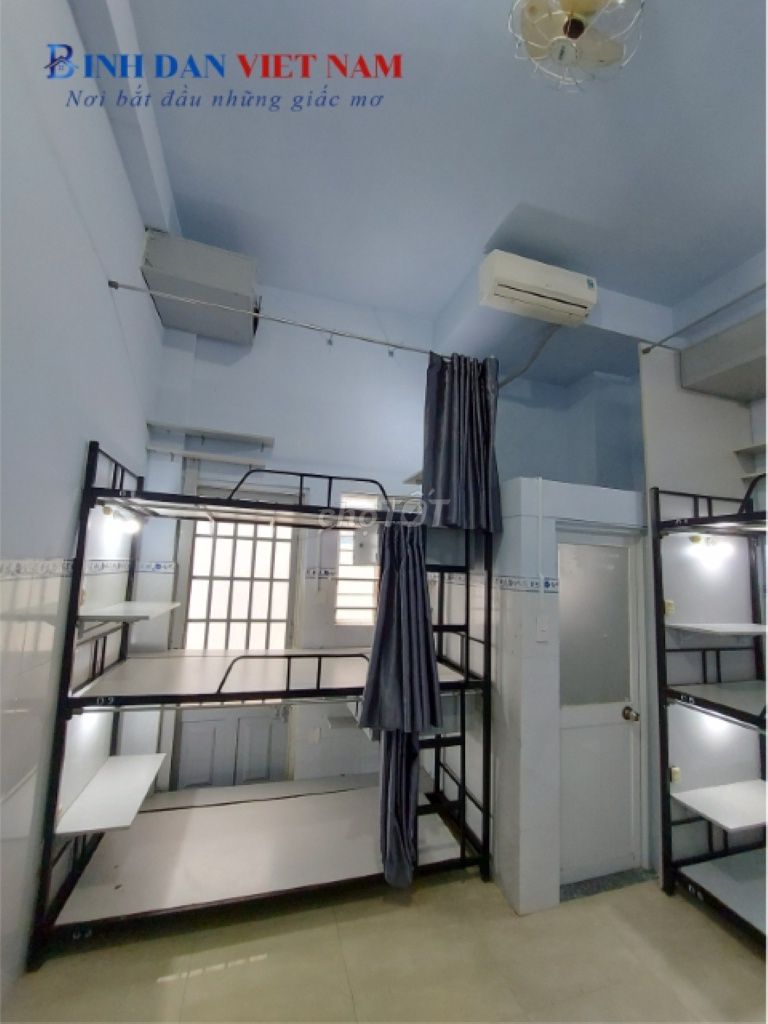 Máy lạnh, quạt thông gió, wifi mạnh, WC riêng, vệ sinh hằng ngày, camera & PCCC 24/7. 🛏️ Giường 1m có vách ngăn & rèm che, tủ cá nhân khóa riêng, kệ sách, bàn gấp, ổ cắm & đèn học riêng, giá treo đồ.
