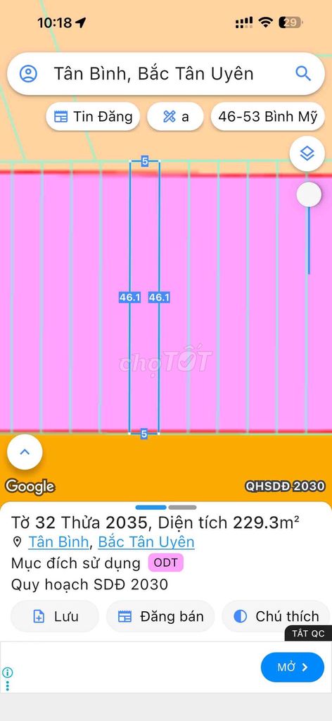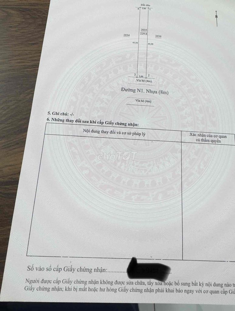 Lô đất có diện tích 230 m² (5 × 46 m), hướng Tây Bắc, đất thổ cư, đã có sổ hồng, nằm trong khu dân cư đông đúc với mặt tiền đường N1 thông thoáng, thuận tiện kết nối các khu vực. Giá đề xuất 2,99 tỷ đồng tương đương khoảng 13 triệu đồng/m².