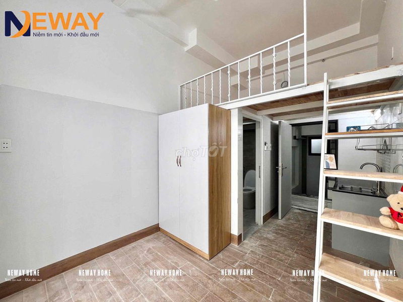 - Phòng có gác lửng và cửa sổ trời lớn giúp không gian thoáng đãng, khác biệt so với phòng trọ tối, chật hẹp thông thường.