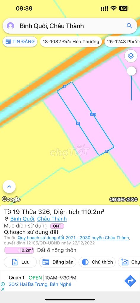 Đất thổ cư 100% diện tích 110m² (5m x 22m) tại Ấp Bình Thủy, Xã Bình Quới, huyện Châu Thành, Long An với giá bán 580 triệu đồng, tương đương khoảng 5,27 triệu đồng/m². Đây là mức giá khá sát với mặt bằng giá đất thổ cư vùng ven Long An hiện nay, đặc biệt khu vực gần TP Tân An đang có xu hướng phát triển mạnh do quy hoạch mở rộng đô thị.
