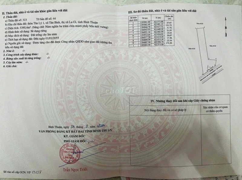 - Vị trí: Đất nằm tại xã Tân Bình, La Gi, Bình Thuận, gần đường nhựa Lê Đức Thọ và Lương Đình Của (khoảng 500m), mặt tiền kênh tiếp nước sông Dinh, tạo sự mát mẻ quanh năm, thuận lợi cho phát triển nông nghiệp hoặc nghỉ dưỡng.