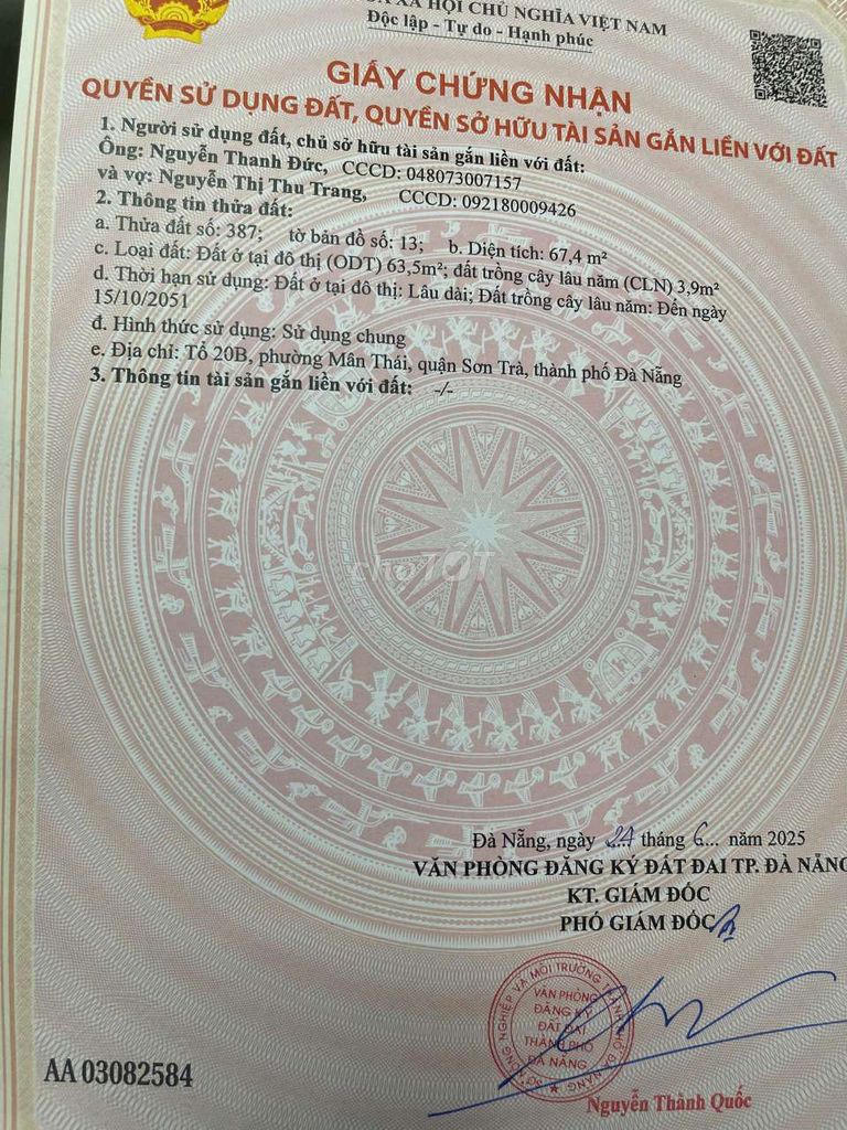 | Hướng đất | Bắc (theo data chính xác hơn) | Hướng Bắc là hướng có thể đón gió mát, phù hợp khí hậu Đà Nẵng | Hướng đất phù hợp, tăng giá trị sử dụng. |