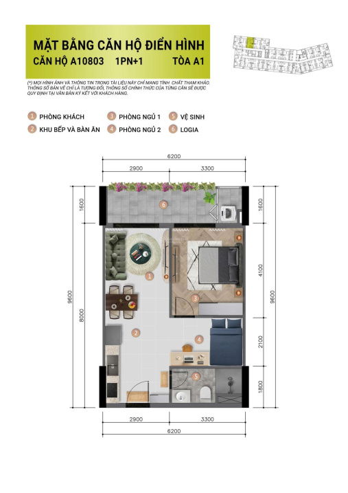 - Loại hình: 1PN+ 1 với 1 Phòng khách, 1 WC và công năng như 2 phòng ngủ