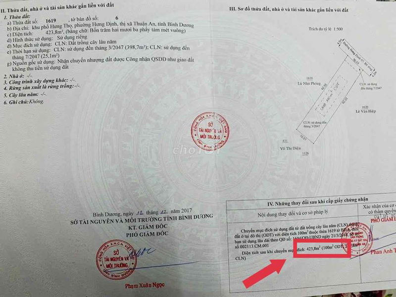 Với diện tích 423 m² (10×42 m), đất thổ cư đã có sổ, giá đưa ra là 6,5 tỷ đồng, tương đương mức giá khoảng 15,37 triệu đồng/m². Đây là mức giá ban đầu cần xem xét kỹ trên thị trường thực tế khu vực Thuận An, Bình Dương.