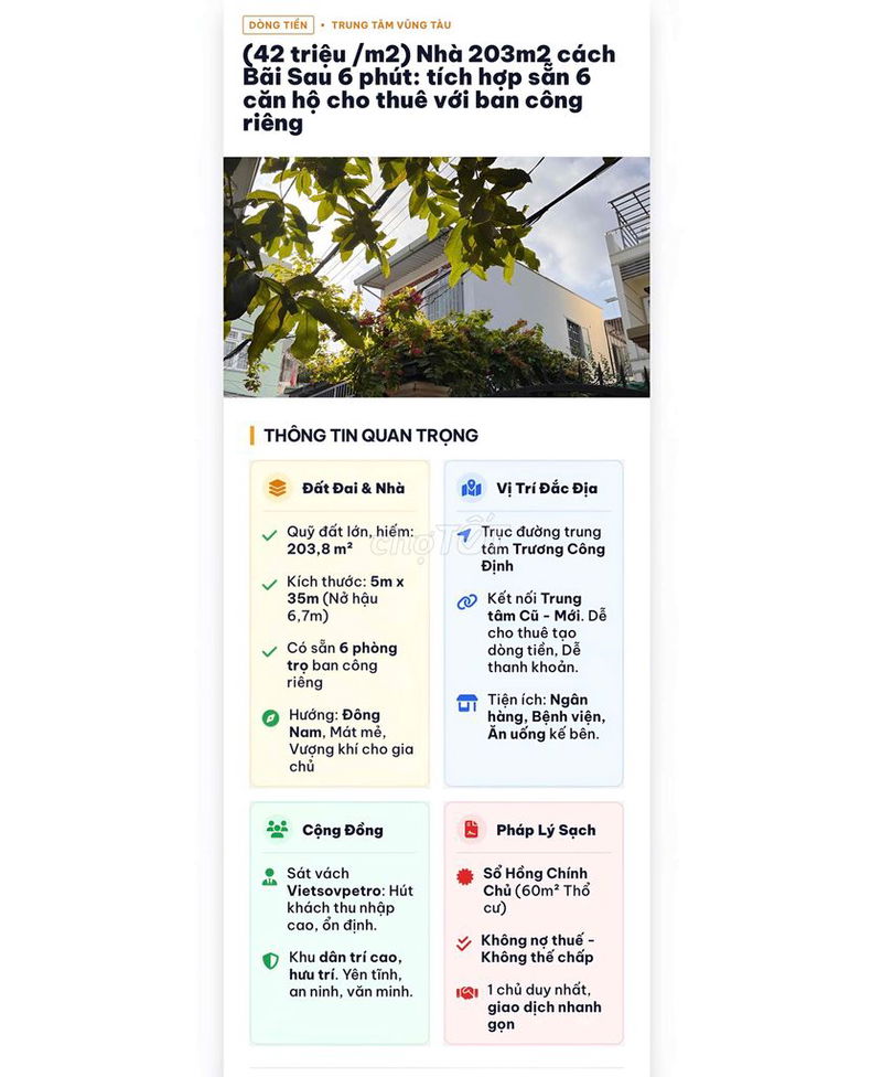 | Phường 3, Vũng Tàu | 210 | Nhà có cho thuê phòng trọ | 40 | 8,4 | Thu nhập cho thuê ổn định |