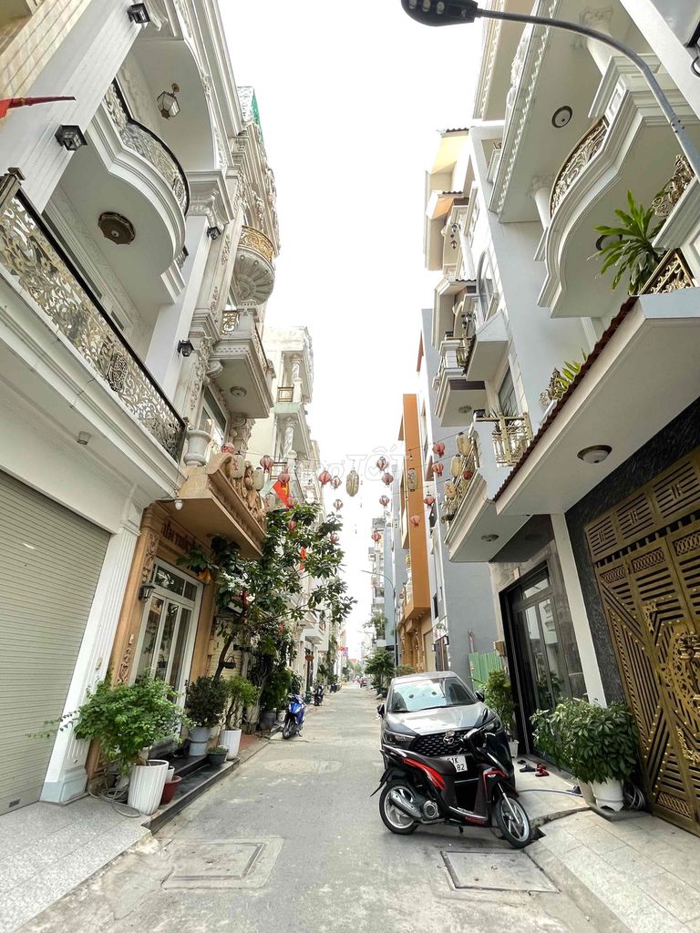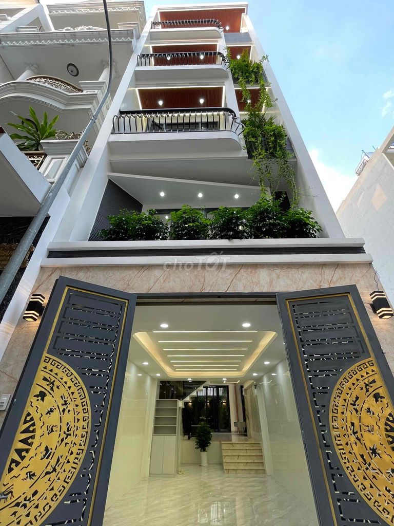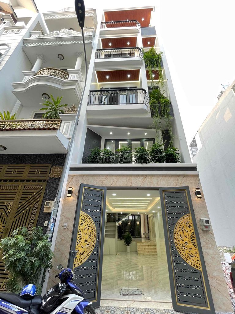 Căn nhà có diện tích đất 76 m² với kích thước ngang 4 m và dài 19 m, gồm 1 trệt, 1 lửng và 3 lầu, tổng cộng 5 tầng. Nội thất được trang bị cao cấp, có 4 phòng ngủ và 5 phòng vệ sinh, thuộc dạng nhà trong hẻm rộng đủ xe hơi đi lại thuận tiện. Pháp lý rõ ràng với sổ hồng đầy đủ.