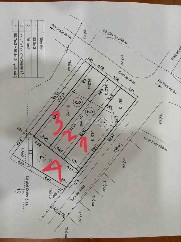 | Lô đất đề xuất | 80 | 4,39 | 54,88 | Hẻm xe hơi 5m, đường Thới An 4, Quận 12 | Hiện tại |