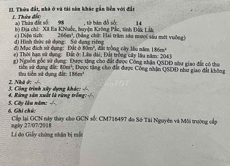 | Xã Ea Knuec, Huyện Krông Pắc (lô đất đang xét) | 266 | Thổ cư 80m², còn lại đất vườn | 9,02 | 2,4 | Gần Quốc Lộ 26, đường nhựa xe tải, khu sầm uất, tiện kinh doanh | 2024 |