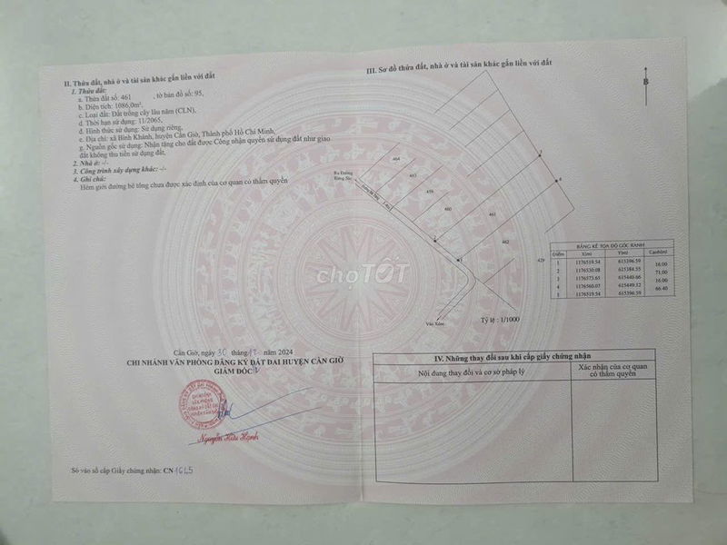 Bình Khánh, Cần Giờ (lô hiện tại) 1086 3,5 3,8 Đất nông nghiệp, đường bê tông 3,4m, gần tuyến đường mới