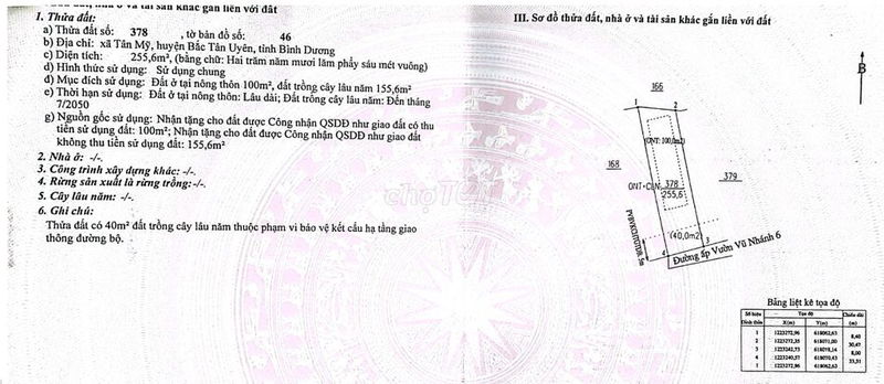 - Thửa đất đang xem xét có diện tích 255,6 m², trong đó thổ cư chỉ chiếm 100 m², còn lại là đất CLN (cây lâu năm), nên giá đất thổ cư thực tế sẽ phải được cân nhắc kỹ vì chỉ phần đất thổ cư mới được xây dựng tự do.