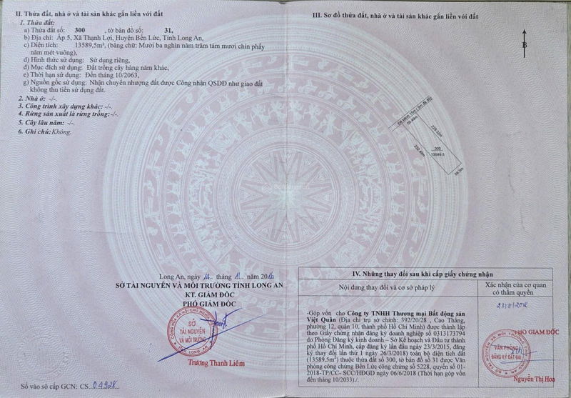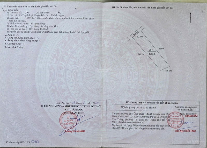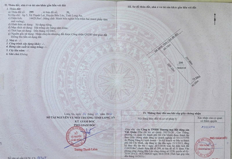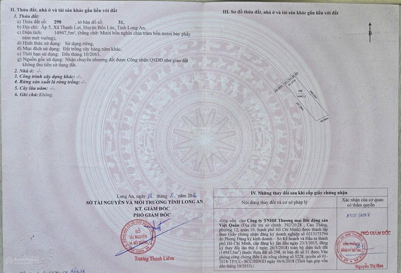 Thông tin mảnh đất có diện tích lớn với tổng 75.221m², gồm 4 thửa đất liền kề, thuộc xã Thạnh Lợi, huyện Bến Lức, tỉnh Long An. Đất thuộc nhóm HNK (đất trồng cây hàng năm khác), pháp lý sạch, ranh giới rõ ràng, mặt tiền kênh T6 dài 246m và nằm rất gần tuyến đường quy hoạch Vành Đai 4 TP.HCM, là điểm cộng lớn về mặt kết nối và tiềm năng phát triển trong tương lai.