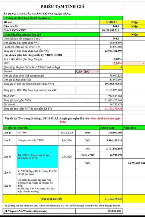 Giá 129 triệu/m² cho biệt thự song lập tại Vinhomes Ocean Park 2, Long Hưng, Văn Giang, Hưng Yên là mức giá được quảng cáo hiện nay. Với diện tích 144 m² và tổng giá bán khoảng 18,5 tỷ đồng, mức giá này phản ánh vị trí đắc địa, thiết kế hiện đại và các tiện ích đồng bộ của khu đô thị. Tuy nhiên, để đánh giá mức giá này có thực sự hợp lý hay không, cần so sánh với các sản phẩm tương tự trong khu vực và phân tích các yếu tố ảnh hưởng.