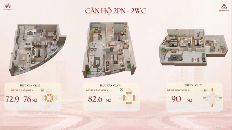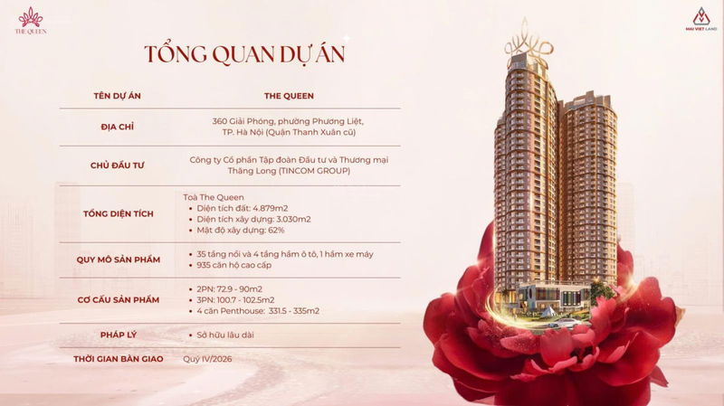 | The Queen, Giải Phóng | Thanh Xuân | 73 (2PN) | 95 | Đầy đủ, cao cấp | Sổ đỏ lâu dài | Full nội thất nhập khẩu, bàn giao Q1/2027 |