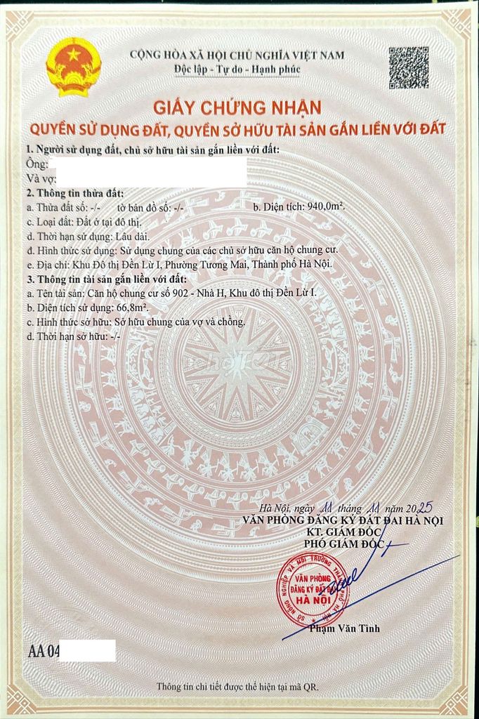 | Nhà H, Đền Lừ 1, Hoàng Mai | 66,8 | 4,2 | 62,87 | Chung cư | Bàn giao thô | 2024 |