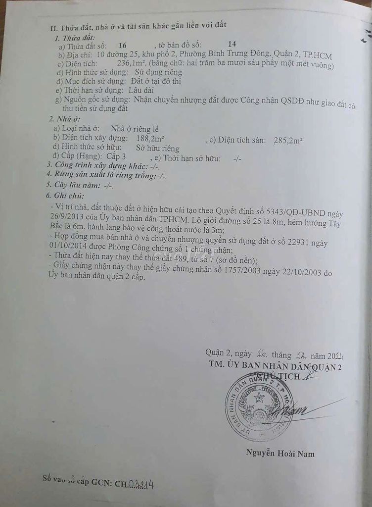 | Đường số 25, Bình Trưng Đông | 200 | 16 | 80 | Đất thổ cư, mặt tiền, nhà cấp 4, hẻm xe hơi |
