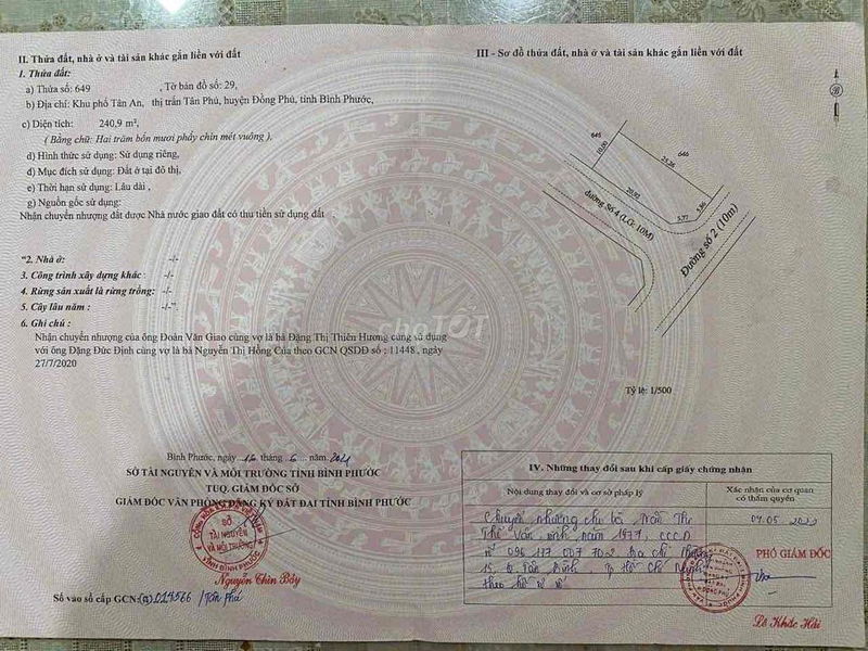 Thị trấn Tân Phú, Đồng Phú 240 1,7 7,08 Đất thổ cư Mặt tiền, sổ hồng, pháp lý đầy đủ