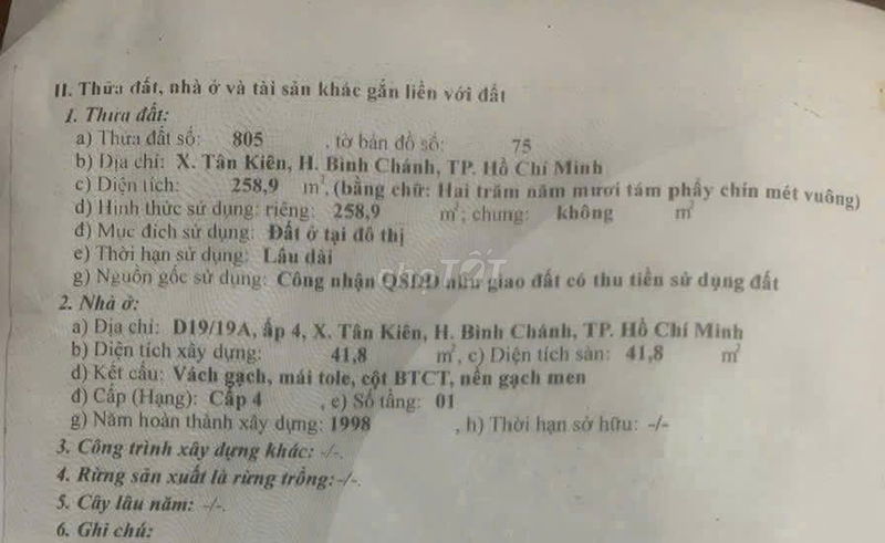 Xã Tân Kiên, Bình Chánh 259 16,6 Thổ cư Sổ hồng riêng, xây dựng tự do, hẻm 3 gác cách đường xe hơi 100m