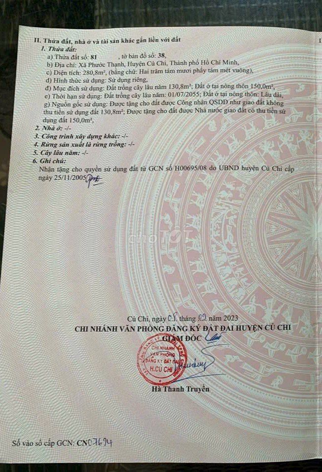 Phước Thạnh, Củ Chi (Lô đất đang xem) 280 620 2,21 Đường nhựa, gần chợ, có 150m2 thổ cư