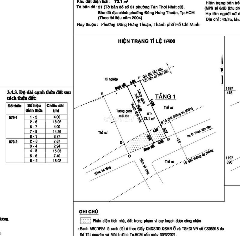 | Đường Phan Văn Hớn, Quận 12 (lô đất đề cập) | 72 | 72,92 | 5,25 | Hẻm xe hơi 5m, sắp nâng lên 7m, đất thổ cư, chờ sổ | 2024 |