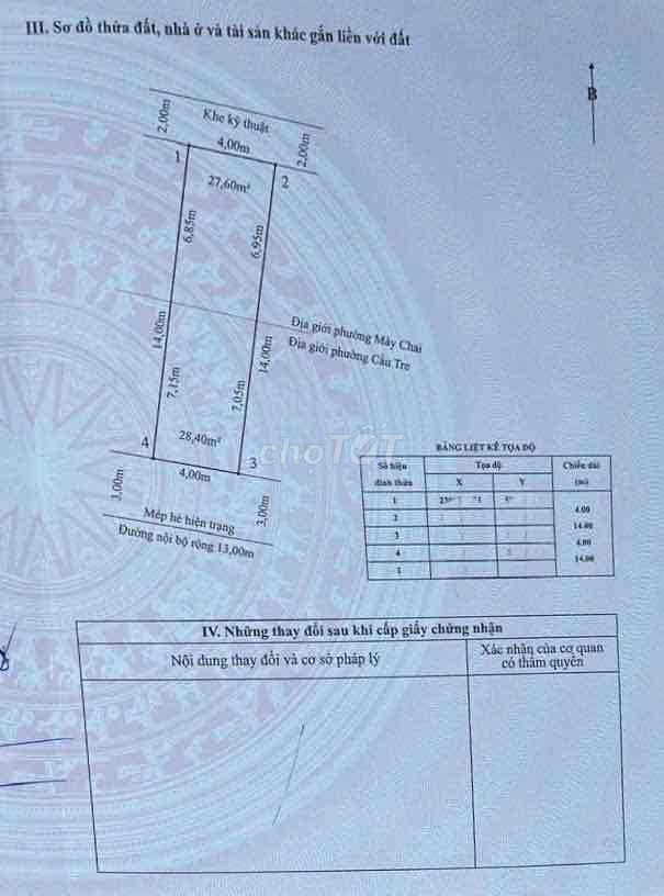 | Đường Lê Thánh Tông, Máy Chai | 56 | 128 | 7,168 | Mặt tiền, đường rộng 13m, sổ đỏ |