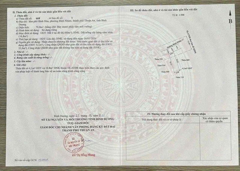 Diện tích đất 70,8m², trong đó thổ cư 60m², mặt tiền 4,6m, chiều dài 16,6m. Giá bán 2,6 tỷ tương đương khoảng 36,72 triệu/m². Đây là mức giá khá cao so với mặt bằng đất thổ cư tại Bình Nhâm, Thuận An hiện nay, thường dao động khoảng 25-30 triệu/m² cho các lô đất hẻm xe hơi rộng 4m như thế này.