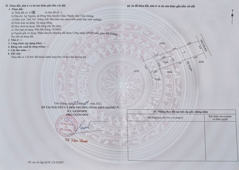 | Đông Hòa, Châu Thành, Tiền Giang | Đất thổ cư mặt tiền kinh Xáng | 323 | 2,79 | 900 | 2024 |