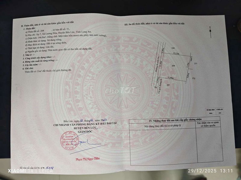 Diện tích: 146,8 m², chiều ngang 11m, chiều dài 13,4m. Giá chào bán 1,55 tỷ đồng tương đương khoảng 10,56 triệu đồng/m². Đây là mức giá đất thổ cư tại khu vực Bình Chánh, xã Phạm Văn Hai, gần Đại Lộ Lương Hoà, một vùng đang phát triển nhưng chưa phải trung tâm thành phố.