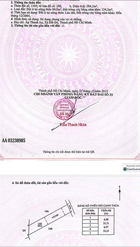 Với diện tích 204 m² (6m x 35m, nở hậu 6,9m), giá bán 580 triệu đồng tương đương khoảng 2,84 triệu đồng/m². Đây là mức giá khá hấp dẫn trên thị trường đất thổ cư tại khu vực Bà Rịa – Vũng Tàu nói chung và huyện Đất Đỏ nói riêng.