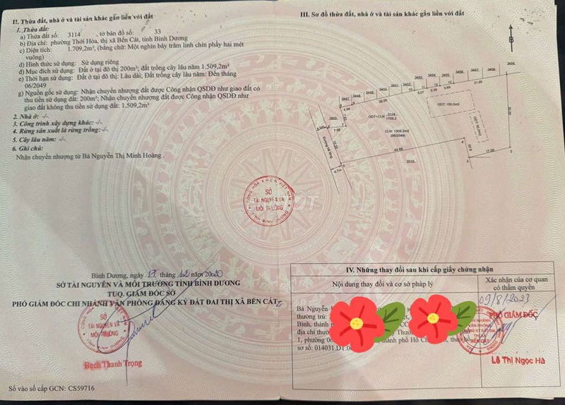 Giá chào bán 6,99 tỷ tương đương khoảng 4,09 triệu đồng/m² đối với diện tích đất thổ cư 1709 m² tại vị trí kế bên khu công nghiệp Mỹ Phước 3, Thới Hòa, Thị xã Bến Cát, tỉnh Bình Dương.