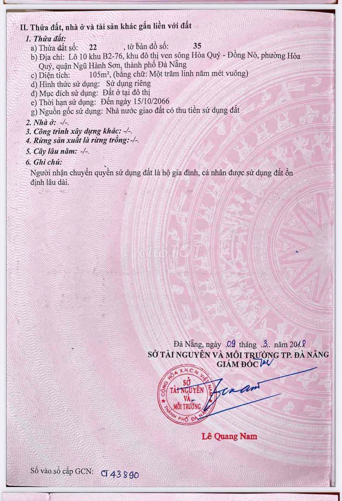 Giá bán được chào 3,65 tỷ tương đương khoảng 33,18 triệu đồng/m² cho một lô đất nền dự án có sổ đỏ rõ ràng, diện tích 110 m², vị trí tại khu vực quận Ngũ Hành Sơn – một trong những khu vực phát triển nhanh và được đánh giá cao về tiềm năng tăng giá tại Đà Nẵng.