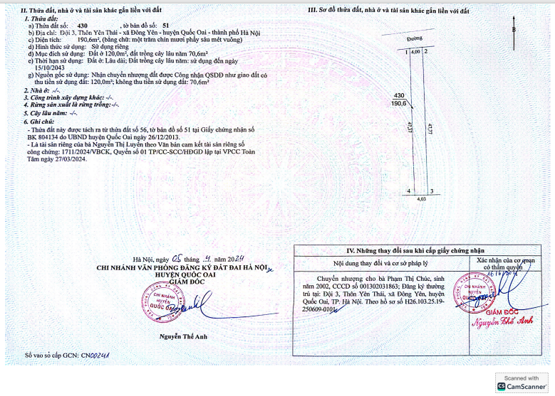 Diện tích đất 190,6 m², trong đó 120 m² đất thổ cư, phù hợp cho cả mục đích xây dựng nhà ở và kinh doanh nhỏ lẻ. Pháp lý rõ ràng với sổ hồng giúp gia tăng tính an toàn cho người mua.
