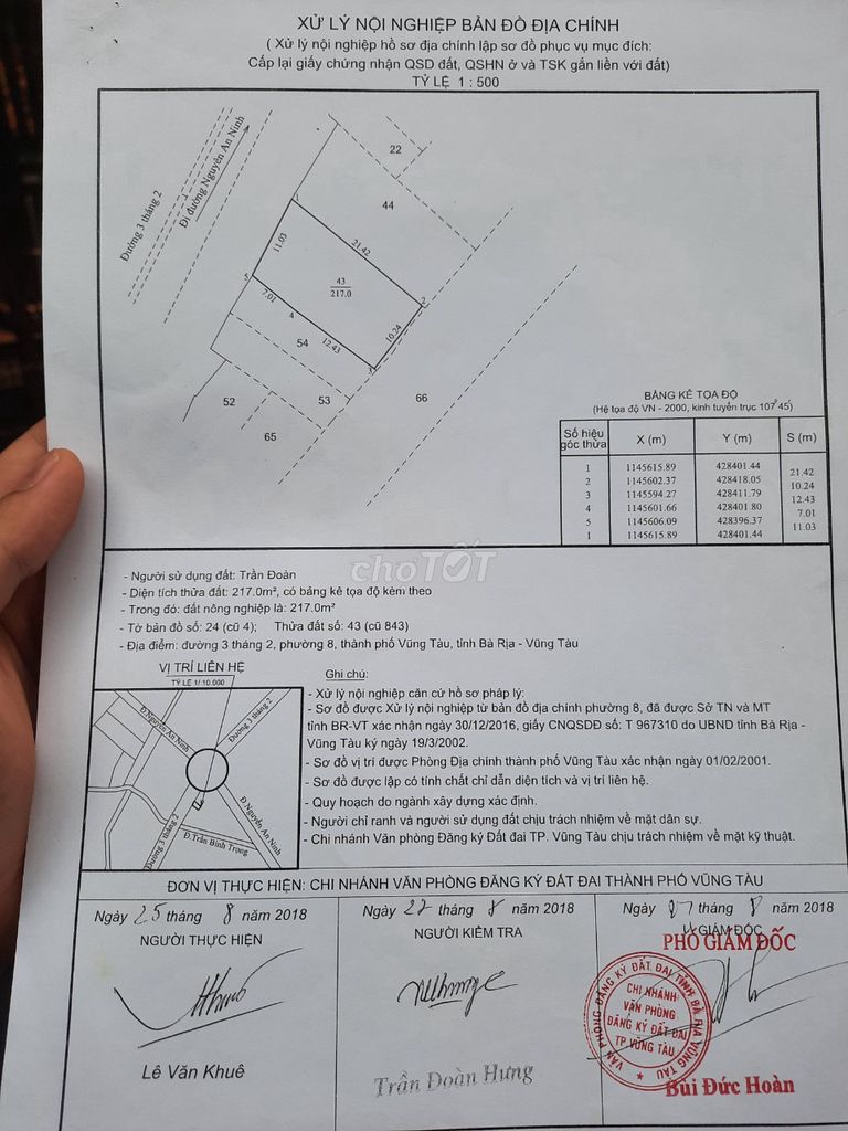 Đường Ba Tháng Hai, Phường 8, Vũng Tàu Đất nông nghiệp 217 66,82 14,5 Mặt tiền, gần bãi Sau, đường rộng 43m 2024