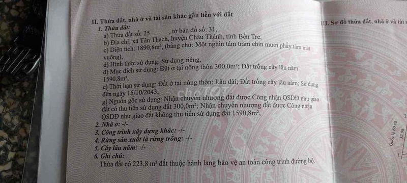 | Vị trí | Mặt tiền Quốc Lộ 60 cũ, cách cầu Gạch Miễu 1km, xã Tân Thạch, huyện Châu Thành | Vị trí mặt tiền quốc lộ, gần cầu, giao thông thuận tiện nhưng là quốc lộ cũ (không phải quốc lộ mới) | Vị trí có tiềm năng phát triển nhưng chưa thuộc khu vực trung tâm hoặc có hạ tầng cao cấp, do đó giá không thể quá cao |