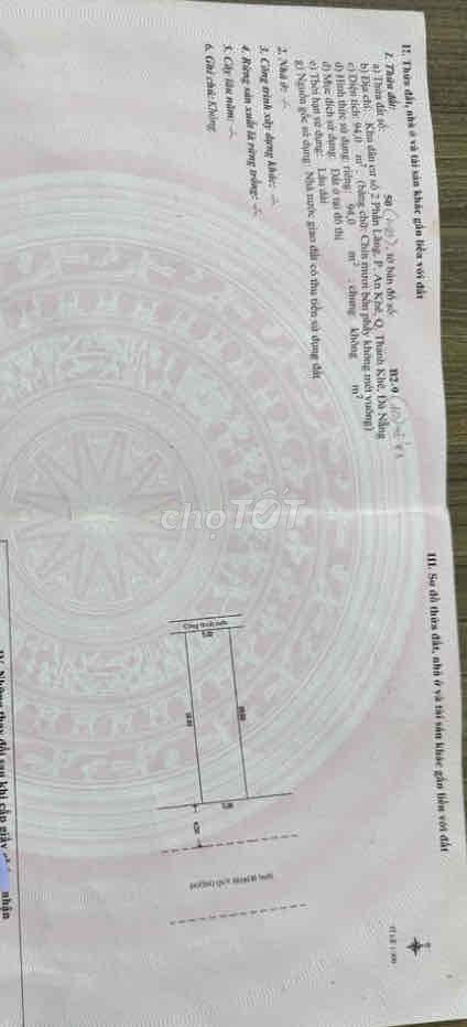 | Diện tích | 94 m² | Thông thường các lô đất mặt tiền ở Thanh Khê từ 60 – 120 m² | Diện tích vừa phải, dễ sử dụng cho kinh doanh hoặc xây nhà ở |
