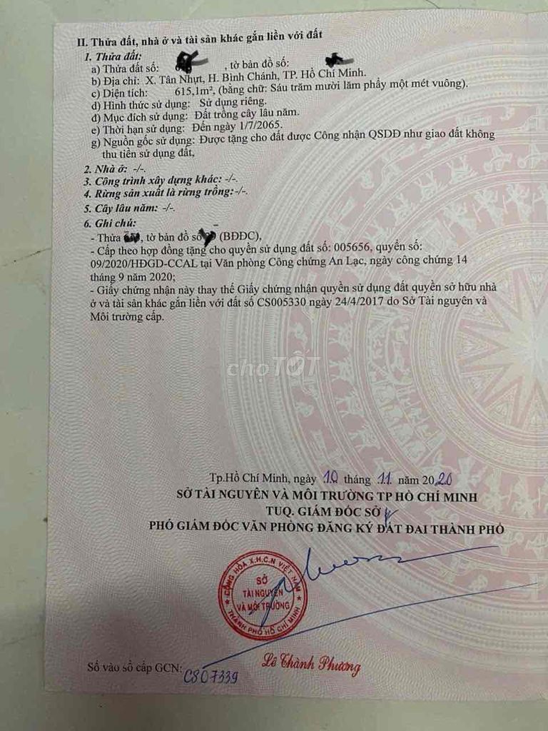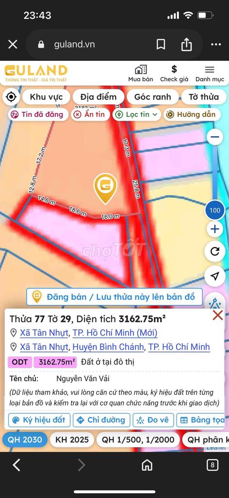 Lô đất có diện tích 600 m², mặt tiền 10.9 m, chiều dài 50 m, thuộc loại đất nông nghiệp, đã có sổ riêng, nằm tại xã Tân Nhựt, huyện Bình Chánh, Tp Hồ Chí Minh. Giá đưa ra là 5,8 tỷ đồng, tương đương 9,67 triệu đồng/m².