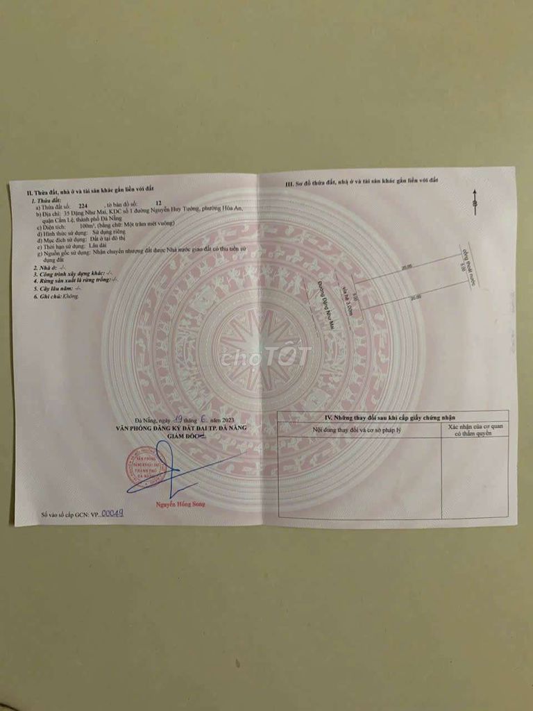 | Diện tích | 100 m² (5m x 20m) | Thông thường lô đất thổ cư tại Cẩm Lệ dao động 80-120 m² |