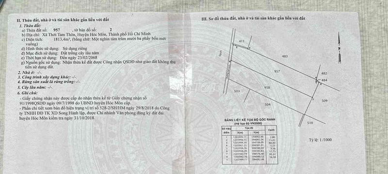 Dựa trên thông tin diện tích 1.813 m² (18×95 m), giá 6 tỷ đồng tương đương khoảng 3,31 triệu đồng/m², thuộc loại đất nông nghiệp, có sổ đỏ và mặt tiền nở hậu tại khu vực xã Thới Tam Thôn, huyện Hóc Môn, TP. Hồ Chí Minh.
