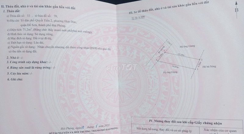 Lô đất có diện tích 72 m², nằm tại vị trí khá thuận lợi thuộc Đường Quyết Tiến, phường Hợp Đức, quận Đồ Sơn, Hải Phòng. Hướng Tây Bắc, có sổ đỏ đầy đủ, đất thổ cư, trong hẻm xe hơi, gần kênh và biệt thự, với tiềm năng phát triển hạ tầng xung quanh như đường Cầu Rào 3, đường nối cao tốc với ven biển.