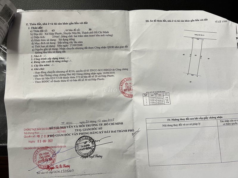 Lô đất có diện tích 256 m², mặt tiền 8 m, chiều dài 32 m, thuộc loại đất nông nghiệp, không có thổ cư, nằm gần cầu Bàu Lê, đường Liên Ấp 3-4, xã Hiệp Phước, huyện Nhà Bè. Giá bán đưa ra là 4,5 tỷ đồng, tương đương 17,58 triệu đồng/m².
