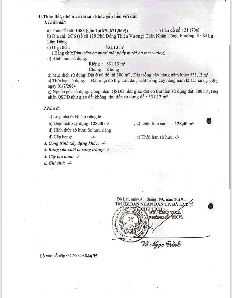 | Phường 8, Đà Lạt | Đất thổ cư, mặt tiền | 831 | 60,17 | 50 | Lô đất hiện tại đang xem xét |