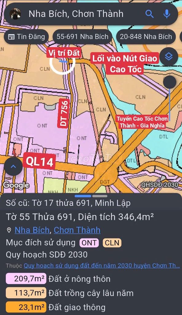 Minh Lập, Chơn Thành, Bình Phước 340 580 1,71 Mặt tiền đường nhựa 20m, đất thổ cư, đã có sổ