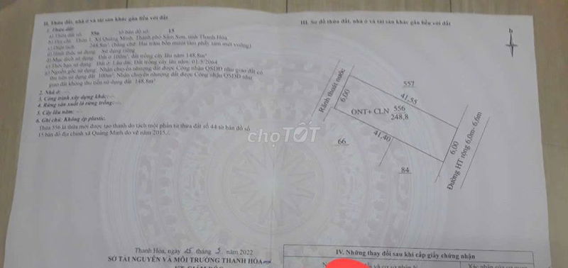 | Phường Trường Sơn, Sầm Sơn | Đất thổ cư | 260 | 5,00 | 1,30 | 2024 | Cách biển 1 km, đường ô tô rộng |