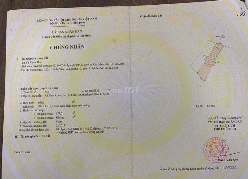 Lô đất có diện tích 679,5 m², trong đó 300 m² là đất thổ cư, tọa lạc tại mặt tiền đường Rừng Sác, xã Bình Khánh, huyện Cần Giờ, Tp Hồ Chí Minh. Giá được chào bán là 13,6 tỷ đồng, tương đương khoảng 20,01 triệu đồng/m².