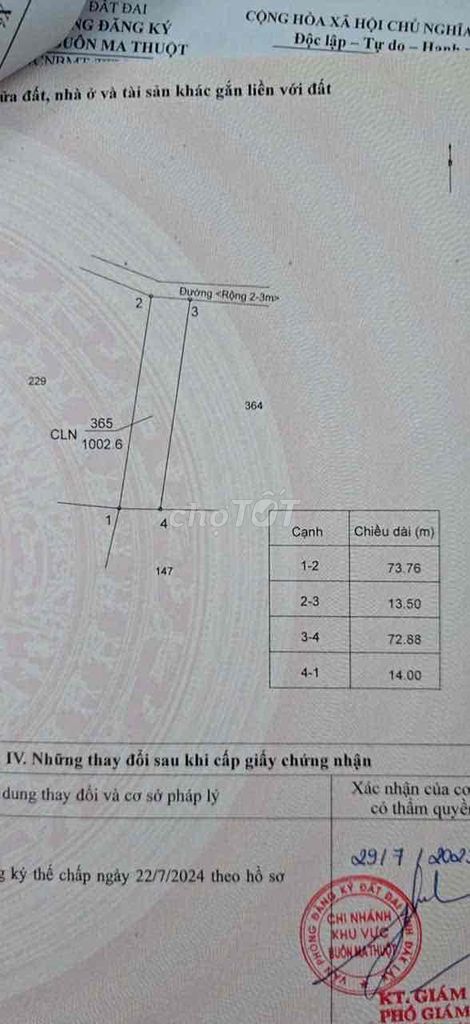 Đất nông nghiệp có diện tích gần 1.000 m² (13.5m x 74m) nằm trong hẻm đường bê tông rộng 3 mét, có sổ đỏ riêng, thuộc Phường Tân Lập, TP. Buôn Ma Thuột, tỉnh Đắk Lắk được rao bán với giá 2,5 tỷ đồng, tương đương khoảng 2,5 triệu đồng/m².