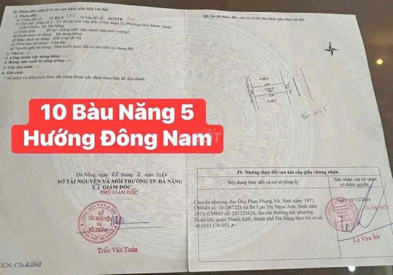 Đất thổ cư tại Bàu Năng 5, Phường Hòa Minh, Quận Liên Chiểu có diện tích 85m² với mặt tiền 5m và chiều dài 17m, hướng Đông Nam thực tế, đường trước đất rộng 5.5m, lề 3m. Giá chào bán là 5,93 tỷ đồng, tương đương 69,76 triệu đồng/m².