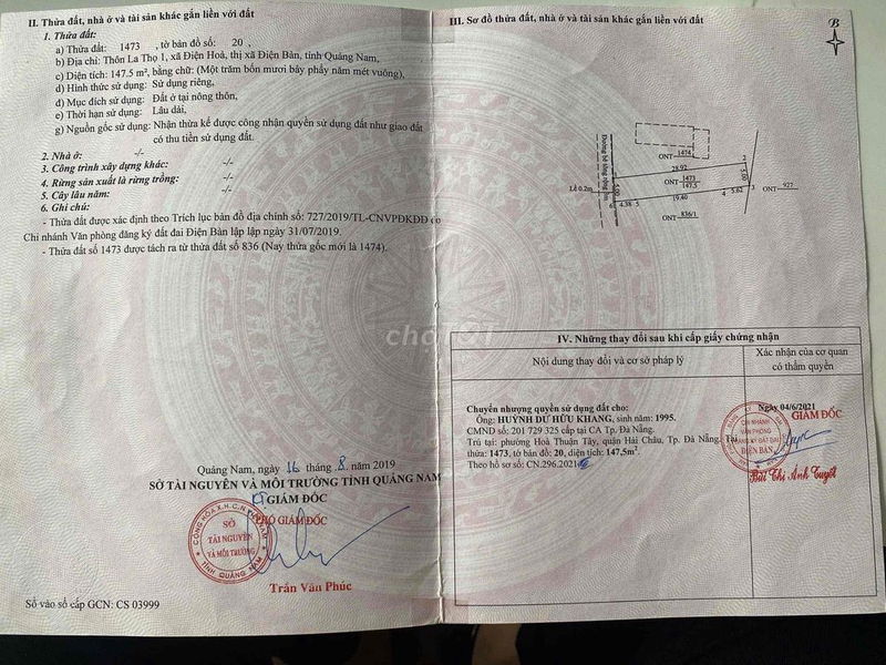 | La Thọ 1, Điện Hòa, Điện Bàn | 147,5 | 5,76 | 850 | Sổ đỏ, thổ cư 100% | Gần chợ, đường bê tông ô tô, dân cư đông đúc |