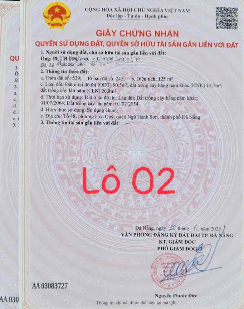 | Mai Đăng Chơn, Ngũ Hành Sơn | 250 m² | 26,8 | Thổ cư | Gần trường học, chợ, bệnh viện quốc tế | Hẻm ô tô 5m, đất đôi |