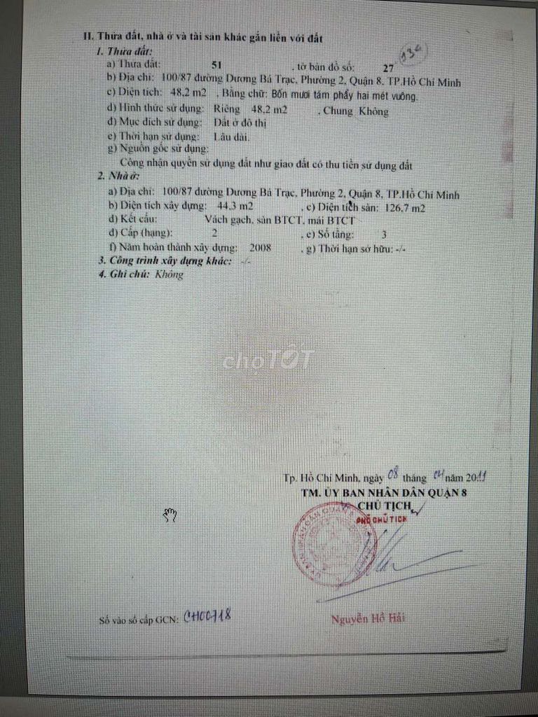 Bán nhà chỉ 7,49 tỷ, 1 trệt 3 lầu, 6 phòng ngủ sân thượng, kiên cố ở ngay tại 100/87 Đường Dương Bá Trạc Phường 2 Quận 8 TPHCM, DT 4x12, 48,2 m2 đất, 1trệt 3 lầu, 6 PN, 6WC, ban công rộng cả 3 tầng lầu, nhiều cửa sổ thông thoáng, nhà đúc thật kiên cố hoàn công, 20m đến nhà lồng chợ Rạch Ông, khu ăn uống, tiện lợi, gần trường học, 5p sang Q1, Q5. Nhà đẹp ở ngay. Mua để ở, mua cho con đi làm đi học ngay trung tâm, gần chợ trường, UBND Phường Chánh Hưng. LH A Đại. Hh 2%