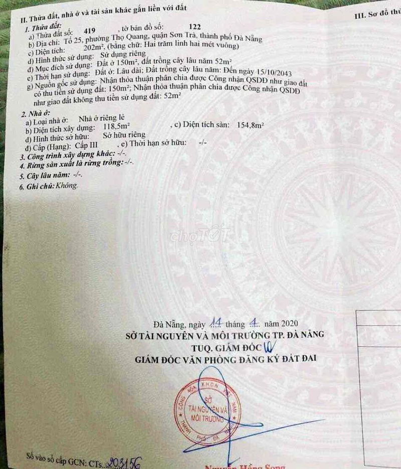 | Phường Thọ Quang, Sơn Trà | Nhà biệt thự | 220 | 13.2 | 60 | Cách biển 250m, hẻm rộng, sổ đỏ |